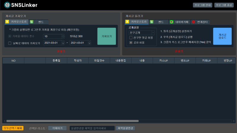 snsLinker는 PC버전(윈도우)용으로 개발되었습니다. 모바일에서는 사용이 불가합니다.